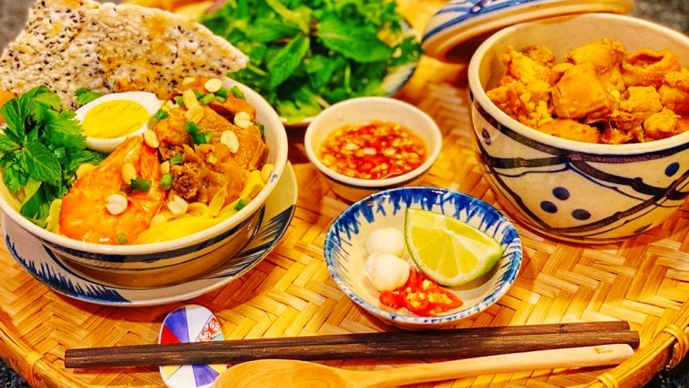 Quảng noodles are flat, chewy rice noodles often infused with turmeric. These are placed atop fresh ingredients and tossed with proteins including pork, chicken, shrimp, or quail eggs. A yummy ladle of broth is added.White Rose, Banh My, Banh Can, Hoanh Thanh,…